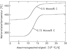 Abbildung 2 zeigt die Abhängigkeit von MS und Mf vom Kohlenstoffgehalt unlegierter Stähle. Unterschreitet Mf die Abschrecktemperatur Tu (z.B. Raumtemperatur), so verbleibt im Umwandlungsgefüge Restaustenit, der sich mit der empirischen Beziehung