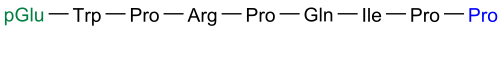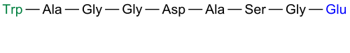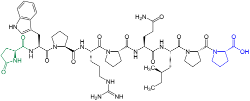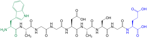 Aminosäurensequenz nach IUB/ IUPAC[1] (mit interaktivem Schaltfeld) und Strukturformel (mit grün gefärbtem N-Terminus und blau gefärbtem C-Terminus) |