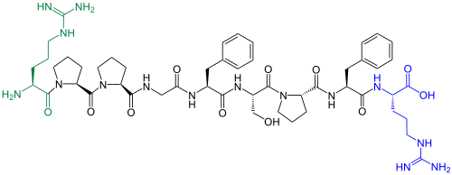 Das Kinin Bradykinin zählt zu den Gewebshormonen und wurde 1948 von einer Gruppe um den Brasilianer Maurício Rocha e Silva (1910–1983)[3] im Blutplasma entdeckt, als das Gift der Lanzenotter Bothrops jararaca einem Hund injiziert wurde.[4][2] Wie bei diesen Kininen üblich wirkt es blutdrucksenkend, erhöht die Gefäßpermeabilität und führt zur Kontraktion der glatten Muskulatur von Darm, Uterus und Bronchien.[4] Dieses Nonapeptid wird ausgeschüttet, wenn der Körper auf ein Trauma oder eine Verletzung reagiert. Dabei werden Botenstoffe durch die Leukozyten freigesetzt, was darauf hindeutet, dass Bradykinin u. a. am Schmerzempfinden und Entzündungen beteiligt ist.[5] So wird infolge einer Injektion von Bradykinin z. B. Schmerz empfunden und es werden Schwellungen sichtbar.[6]