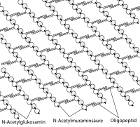 Peptidoglycan (PGN), Peptidoglykan (pl. Peptidoglycane bzw. Peptidoglykane), auch Murein (aus dem Latein murus = Mauer, Wall, Schutz[1]), seltener Polysaccharid-Peptid genannt, ist ein aus Zuckern und Aminosäuren zusammengesetztes Makromolekül, das charakteristisch ist für die Zellwand (Murein-Sacculus) der Bakterien (Domäne Bacteria[2]).[3] Sowohl grampositive als auch gramnegative Bakterien besitzen in ihrer Zellwand eine Festigkeit verleihende Schicht aus einem Peptidoglycan. Die Dicke der Hülle ist unterschiedlich, bei grampositiven 20 bis 80 nm, bei gramnegativen weniger als 10 nm. Ausnahmen bilden die L-Formen von Bakterien und die zur Domäne der Bakterien zählenden Mycoplasmen und Spiroplasmen, die keine Zellwand und damit auch keine Mureinhülle besitzen, sowie die Planctomyceten,[4] die eine proteinreiche S-Layer-Zellwand aufweisen.