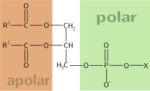 Die Struktur von Phosphoglyceriden kann man auch als die von Fetten auffassen, bei denen eine Fettsäure durch einen Phosphorsäureester ersetzt ist. Durch die beiden Fettsäurereste (R1COO- und R2COO-) und den Alkohol (X) werden die Funktion und die Eigenschaften des Phosphoglycerids entscheidend bestimmt. Der Alkohol kann beispielsweise Serin, Cholin, Inosit oder Colamin sein. Handelt es sich um eine Veresterung mit Cholinen, so entstehen Lecithine (auch Phosphatidylcholine); bei der Veresterung mit Serin werden Kephaline gebildet. Falls die erste Fettsäure eines Phospholipids durch einen langkettigen Enolether oder einen Aldehyd mit 16–20 Kohlenstoffatomen ersetzt wird, nennt man die entstehenden Phosphoglyceride Plasmalogene.