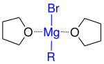 Diese Reaktion wird in nukleophilen Lösungsmitteln, die keinen aktiven Wasserstoff besitzen, wie wasserfreiem Diethylether oder höheren Ethern (Dibutylether, Anisol, Tetrahydrofuran) durchgeführt. Je zwei freie Elektronenpaare von diesen Ethermolekülen sind komplex an das Magnesium gebunden und stellen das zur Stabilität notwendige Elektronenoktett her, was in der Literatur, hier am Beispiel des Tetrahydrofurans, so präsentiert werden kann: