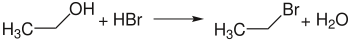 Ethanol und Bromwasserstoff reagieren zu Ethylbromid und Wasser:
