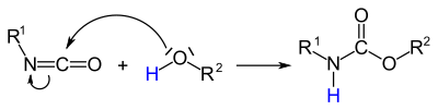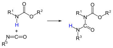 Durch einen Überschuss von Diisocyanat können lineare Polyurethane vernetzt werden. Durch Addition einer Isocyanat-Gruppe an eine Urethan-Gruppe bildet sich eine Allophanat-Gruppe.