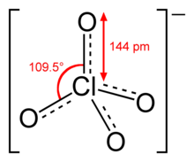 Das Perchlorat-Ion ist perfekt tetraedrisch gebaut, die Chlor-Sauerstoff-Bindungen sind gleich lang und gleichwertig. Die Bindungsverhältnisse können völlig analog zum isoelektronischen Sulfat-Ion durch Mesomerie mit drei delokalisierten Doppelbindungen oder durch Ladungstrennung mit einem formal dreifach positiv geladenen Chloratom erklärt werden.