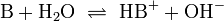 Eine allgemeine Base B reagiert nach folgendem Schema mit Wasser. Die Doppelpfeile deuten ein chemisches Gleichgewicht an.