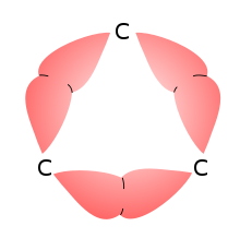 Dies führt zum Bild „gebogener“ C–C-Bindungen (engl. bent bonds), die man salopp auch als „Bananenbindungen“ bezeichnet hat. Die Valenzwinkel (Innenwinkel) der C–C–C-Bindungen betragen 104°.