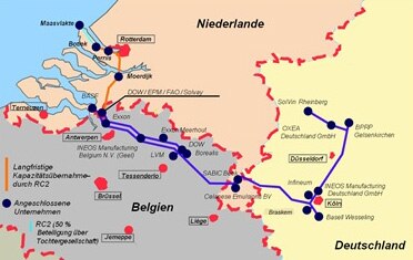 Aufgrund des steigenden Bedarfs wurde in den 1960er Jahren eine Ethen-Pipeline konzipiert, die Ethen zwischen den Herstellern und Verbrauchern in den Niederlanden, Belgien und Deutschland transportiert. Aus Gründen der Wirtschaftlichkeit und der Sicherheit wird Ethen grundsätzlich nur per Pipeline transportiert. In Deutschland und Teilen der Niederlande und Belgiens wurde 1974 die Ethylene-Pipeline ARG zum Transport von Ethen zwischen den Chemiestandorten von Rotterdam über Antwerpen in den Raum Köln und in die Emscher-Lippe-Region sowie in das Rhein-Main-Gebiet und nach Ludwigshafen am Rhein in Betrieb genommen. Die Ethylene-Pipeline ARG hat eine Länge von etwa 500 Kilometern und transportiert jährlich bis 2,0 Millionen Tonnen Ethen zu etwa 20 direkt angeschlossenen petrochemischen Unternehmen.[28]