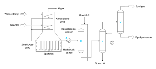 Obwohl es verschiedene Arten von Crackern gibt, besteht der wesentliche Verfahrensschritt darin, Kohlenwasserstoffe und Wasserdampf bei Temperaturen von 800 bis 900 °C in einen Crackofen einzuspritzen, wobei die Temperaturen für das Cracken von Ethan höher sind als für schwerere Rohstoffe. Die Verweilzeit liegt im Bereich von einer Sekunde oder darunter.[46]