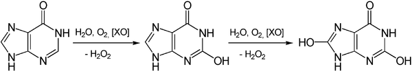 Auch der Abbau von Guanosinmonophosphat läuft über Xanthin als Zwischenprodukt, welches dann auf gleichem Wege unter Bildung von Wasserstoffperoxid zu Harnsäure umgesetzt wird.