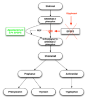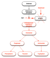 Glyphosat blockiert das Enzym 5-Enolpyruvylshikimat-3-phosphat-Synthase (EPSPS), das zur Synthese der aromatischen Aminosäuren Phenylalanin, Tryptophan und Tyrosin über den Shikimatweg in Pflanzen, wie auch in den meisten Mikroorganismen, benötigt wird. Grund für die Blockade ist die chemische Ähnlichkeit von Glyphosat mit Phosphoenolpyruvat (PEP), dem regulären Substrat der EPSPS. Glyphosat ist der einzige bekannte Herbizidwirkstoff, der effektiv EPSPS blockiert.