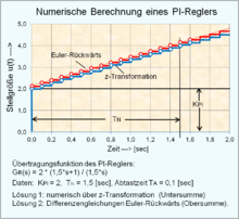 - Bei schnellen Regelstrecken können die realen Schnittstellen des Reglers durch die signaltechnischen Verzögerungen als Ersatztotzeit berücksichtigt werden. Im Gegensatz zur Laplace-Transformation kann eine z-transformierte Übertragungsfunktion mit einer Totzeit im Rahmen der Rechenregeln der z-Transformation durch Rückwärtsverschiebung "Verschiebung nach rechts" um d = Tt / TA-Abtastschritte als komplette z-Übertragungsfunktion berechnet werden.