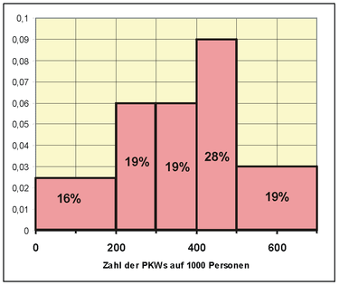 Es liegen für 32 europäische Länder als Indikator für den Wohlstand die Zahlen der PKWs pro 1000 Einwohner vor. Die Werte werden wie folgt in Klassen eingeteilt: