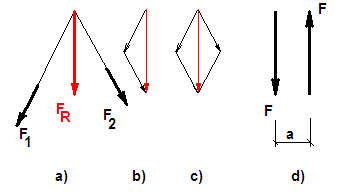 Wenn die vektorielle Summe der Einzelkräfte verschwindet, so ist die resultierende Kraft gleich null. Das ist z.B. bei einem Kräftepaar der Fall (Abbildung d.); es verbleibt ein Einzelmoment, wobei das Hebelgesetz gilt.