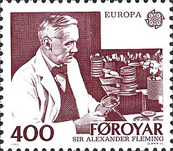 Bereits 1874 hatte der Chirurg Theodor Billroth in Wien zweifelsfrei den das Wachstum von Bakterien hemmenden Effekt des Pilzes Penicillium erkannt.[13] Im Jahr 1923 erforschte in San José/Costa Rica Clodomiro Picado Twight, ein ehemaliger Wissenschaftler des Institut Pasteur, die wachstumshemmende Wirkung auf Staphylokokken und Streptokokken. Seine Forschungsergebnisse wurden 1927 von der Société de biologie in Paris veröffentlicht.[14] Die weitaus öffentlichkeitswirksamere (Wieder-)Entdeckung der Penicilline begann mit einer verschimmelten Bakterienkultur ein Jahr darauf: Alexander Fleming, der sich am St. Mary’s Hospital in London mit Staphylokokken beschäftigte, hatte 1928 vor den Sommerferien eine Agarplatte mit Staphylokokken beimpft und dann beiseite gestellt. Bei seiner Rückkehr entdeckte er am 28. September 1928, dass auf dem Nährboden ein Schimmelpilz (Penicillium notatum) wuchs und sich in der Nachbarschaft des Pilzes die Bakterien nicht vermehrt hatten. Fleming nannte den bakterientötenden Stoff, der aus dem Nährmedium gewonnen werden konnte, Penicillin und beschrieb ihn für die Öffentlichkeit erstmals 1929 im British Journal of Experimental Pathology.[15] Er untersuchte die Wirkung des Penicillins auf unterschiedliche Bakterienarten und tierische Zellen; dabei stellte er fest, dass Penicillin nur grampositive Bakterien wie Staphylokokken, Streptokokken oder Pneumokokken abtötete, nicht aber gramnegative Bakterien wie beispielsweise Salmonellen. Auch gegenüber weißen Blutkörperchen und menschlichen Zellen oder für Kaninchen erwies es sich als ungiftig. Fleming kam trotz dieser Kenntnis offenbar nicht auf die Idee, Penicillin als Medikament einzusetzen.