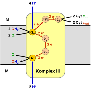 - Transfer von Elektronen vom Coenzym Q (Zwei-Elektronenüberträger) zum Cytochrom c (Ein-Elektronenüberträger)