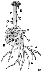 Aus dem Zellkörper gehen Fortsätze hervor: der Neurit und eventuell mehrere Dendriten. Der Neurit, im Verlauf als Axon umhüllt von Gliazellen, entspringt am sogenannten Axonhügel des Perikaryons, wo bei überschwelliger Erregung der Zelle ein Aktionspotential initiiert wird. Erregungen von anderen Nervenzellen können über Synapsen – dendritische an den peripheren Zellfortsätzen und somatische am zentralen Zellkörper – auf den Nervenzellkörper übertragen werden und die Entstehung von Aktionspotentialen fördern oder aber hemmen.