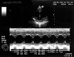 Eine weitere häufig eingesetzte Darstellungsform ist der M- oder TM-Mode (englisch für (time) motion). Dabei wird ein Strahl bei einer hohen Impulswiederholungsfrequenz (1 – 5 kHz) eingesetzt. Die Amplitude des Signals wird auf der vertikalen Achse dargestellt; die von den hintereinander liegenden Impulsen erzeugten Echozüge sind auf der horizontalen Achse gegeneinander verschoben. Diese Achse stellt also die Zeitachse dar.