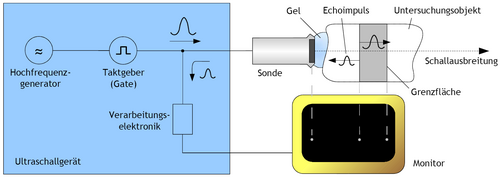 Die Bildgebung mit einem Ultraschallgerät erfolgt nach dem sogenannten Puls-Echo-Verfahren. Ein elektrischer Impuls eines Hochfrequenzgenerators wird im Schallkopf durch den piezoelektrischen Effekt in einen Schallimpuls umgesetzt und ausgesendet. Die Schallwelle wird an Inhomogenitäten der Gewebestruktur teilweise oder vollständig gestreut und reflektiert. Im ersten Fall (teilweise Reflexion/Streuung) verliert der Wellenzug Energie und läuft mit schwächerem Schalldruck so lange weiter, bis durch Absorptionseffekte die Schallenergie vollständig in thermische Energie umgesetzt ist. Ein zurücklaufendes Echo wird im Schallkopf in ein elektrisches Signal gewandelt. Anschließend verstärkt eine Elektronik das Signal, wertet dieses aus und kann es auf verschiedene Weise an den Anwender ausgeben, beispielsweise auf einem Monitor (siehe Darstellungsmethoden).