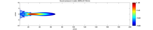 Das Beispiel zeigt das durch Simulationsrechnungen ermittelte Schallfeld eines unfokussierten Ultraschallwandlers mit einer Frequenz f = 4 MHz, einem Durchmesser des Schwingers von 10 mm für Wasser mit einer Schallgeschwindigkeit von c = 1500 m/s. Angezeigt werden die Amplituden der Schalldrücke. Die Nahfeldlänge beträgt N = 67 mm. Man erkennt darin die starke Zerklüftung des Schallfeldes im Nahbereich und das allmähliche Abklingen des Schalldrucks im Fernbereich.[9][10]