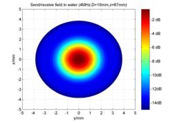 Das Beispiel zeigt einen x/y-Schnitt des zuvor beschriebenen Ultraschallwandlers (4 MHz, Schwingerdurchmesser 10 mm, Nahfeldlänge N = 67 mm) im Fokus bei z = 67 mm. Die 6-dB-Grenze ist gelb eingefärbt und weist eine Breite von ungefähr 2,8 mm auf.