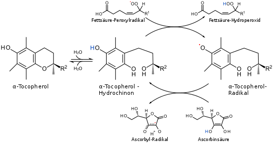 Eine seiner wichtigsten Funktionen ist die eines lipidlöslichen Antioxidans, das in der Lage ist, mehrfach ungesättigte Fettsäuren in Membranlipiden, Lipoproteinen und Depotfett vor einer Zerstörung durch Oxidation (Lipidperoxidation) zu schützen. Freie Radikale würden die Doppelbindungen der Fettsäuren der Zell- und Organellmembranen angreifen. Tocopherol wirkt als Radikalfänger, indem es selbst zu einem reaktionsträgen, da mesomeriestabilisierten Radikal wird. Das Tocopherol-Radikal wird dann unter Bildung eines Ascorbatradikals reduziert. Das Ascorbatradikal wird mit Hilfe von Glutathion (GSH) regeneriert. Dabei werden zwei Monomere (GSH) zu einem Dimer (GSSG) oxidiert.