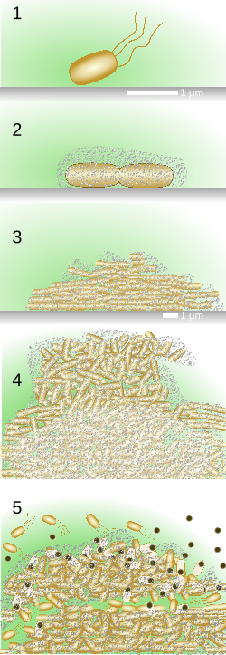 1: Erstbesiedlung einer Fläche durch eine begeißelte Zelle. 2. Beginn der Biofilmbildung durch Zelladhäsion. 3. Exponentielles Wachstum. 4-5. Teilausschnitte der Oberfläche des Biofilms. 4. Nährstoffmangel im Zentrum. 5. Phase der Auswanderung durch Sporulation und begeißelte Zellen.