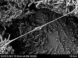 Ein weiteres betroffenes Feld sind die Fremdkörper-assoziierten Infektionen. Hierunter fallen die mikrobielle Kontamination und Besiedlung von Kathetern, Implantaten und medizinischen Instrumenten. Der zunehmende Einsatz von Kunststoffen in der Medizintechnik hat neben den großen inhärenten Vorteilen für Diagnostik und Therapie zu einer Verschärfung der Biofilm-Problematik geführt. Besonders wegen der Affinität verschiedener Mikroorganismen, wie einigen Staphylokokken, zu den Oberflächen von Biomaterialien sind etwa die Hälfte der nosokomialen Infektionen auf chirurgische Implantate zurückzuführen.[20] Als Ausgangspunkt der beteiligten Mikroorganismen gelten die Hautoberfläche von Krankenhauspersonal und Patienten, der Kontakt von Austrittsstellen oder Konnektoren mit Leitungswasser und weitere Quellen aus der Umgebung.[21] Auch die Wasserleitungen von Krankenhäusern und zahnärztlichen Behandlungseinheiten sowie Dialyse-Ausrüstung und schwer zu reinigende Endoskope können betroffen sein. Abhängig von dem verwendeten Medizinprodukt und der Verweildauer kommen grampositive Bakterien, gramnegative Bakterien und Pilze als Einzel- oder Multi-Spezies-Biofilm vor. Beispiele für häufig beteiligte Erreger sind: