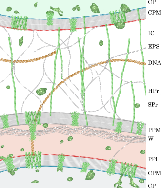 Periplasmamembran (PPM), Zellwand (W), Periplasma (PPl), Cytoplasmamembran und Cytoplasma eines Bakteriums.