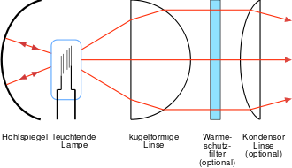 Das Beleuchtungssystem besteht aus Kondensorlinse/n und Lampe und in der Regel noch aus einem Kugelspiegel, wodurch die an der Projektion beteiligte Lichtmenge etwa verdoppelt wird.[4] Dazu gehört oft noch ein Wärmeschutzfilter, das sich bei Zweiteiligkeit des Kondensors zwischen den beiden Linsen befindet.