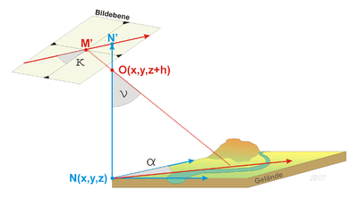 Die äußere Orientierung einer Photogrammetrischen Aufnahme beschreibt die Lage und Position der Kamera während der Aufnahme bezogen auf den Aufnahmegegenstand selbst. Die Position (translatorische Komponente) wird durch die drei Koordinaten (x,y,z) des Projektionszentrums O beschrieben. Bei einer Luftaufnahme wären dies die Koordinaten des Nadirpunktes N im geodätischen System und die Flughöhe h über der Bezugsfläche.