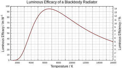 Bei einer Temperatur von 6640 K erreicht der Plancksche Strahler mit 96,1 lm/W das für Plancksche Strahlung maximal mögliche photometrische Strahlungsäquivalent. Bei einer weiteren Steigerung der Temperatur verschieben sich immer größere Anteile der Ausstrahlung ins nicht sichtbare Ultraviolette und das photometrische Strahlungsäquivalent nimmt wieder ab.