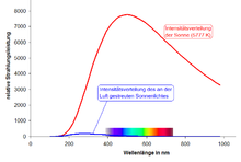 Im Bild ist die abgestrahlte Leistungsverteilung der Sonne, genähert durch das Plancksche Strahlungsgesetz aus einer Oberflächentemperatur von 5777 K, rot eingezeichnet. Das spektrale Maximum liegt danach bei grünem Licht (500 nm Wellenlänge). Das spektrale Maximum des Tageslichtes liegt hingegen u.a. aufgrund des hier beschriebenen Streueffektes bei 550 nm. Die Leistungsverteilung des Streulichtes (blaue Kurve) ergibt sich durch Multiplikation mit ω4. Demnach wandert das Maximum weit in den UV-Bereich. Tatsächlich liegt es aber im nahen UV, da bei kürzeren Wellenlängen molekulare Absorptionen hinzukommen.