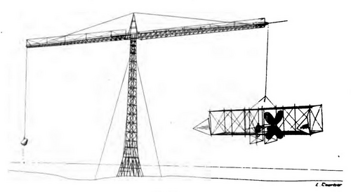 Um den Mangel an Kraft der Motoren zu kompensieren, die er hätte haben können, entwickelte er eine Fahrt von 18 m in Höhe und 30 m im Durchmesser, die er den Flugplatz nannte, was seinen Flugzeugen eine kreisförmige Flugbahn gab, leider sehr windempfindlich (Bild rechts).