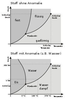 - Für Drücke oberhalb des Tripelpunkt-Druckes ist die Substanz für Temperaturen unterhalb des Schmelzpunktesfest, zwischen Schmelz- und Siedepunktflüssig und oberhalb des Siedepunktes gasförmig. Die Trennlinie zwischen fester und flüssiger Phase, also die Kurve der Schmelzpunkte, nennt man Schmelzkurve, die Trennlinie zwischen Flüssigkeit und Gas nennt man Siedepunktskurve. Beide Kurven beginnen ebenfalls am Tripelpunkt, wobei sich die Schmelzkurve theoretisch bis in das Unendliche fortsetzt und die Siedepunktskurve am kritischen Punkt endet.