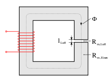 Ein Luftspalt im ansonsten geschlossenen Verlauf eines Eisenkernpaketes oder Ferritkernes vergrößert den magnetischen Widerstand im magnetischen Kreis. Damit berechnet sich die Induktivität für einen magnetischen Kreis mit Luftspalt wie folgt: