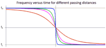 Ein ruhender Beobachter hört eine Schallquelle, die sich genau auf ihn zubewegt, mit der Frequenz {\displaystyle f'_{\mathrm {zu} }(v/c)}, siehe Gleichung (1), wenn sie sich von ihm entfernt, mit der Frequenz {\displaystyle f'_{\mathrm {weg} }(v/c)}, siehe Gleichung (2). Bei Schallquellen spielt der relativistische transversale Doppler-Effekt keine Rolle. Je weiter der Beobachter von der linearen Flugbahn entfernt ist, desto langsamer ändert sich die radiale Geschwindigkeitskomponente bei Annäherung. Die Schnelligkeit der Frequenzänderung hängt ab von der kürzesten Entfernung zwischen Beobachter und Signalquelle. Das Diagramm rechts zeigt die Frequenzabhängigkeit relativ zu einem im Ursprung ruhenden Beobachter. Die rote Linie entspricht der Frequenz, die er hört, wenn ihn die Signalquelle in großem Abstand passiert, blau der bei geringem Abstand. Maximal- und Minimal-Frequenzen liegen nicht symmetrisch zur Eigenfrequenz, da die Geschwindigkeit v nicht sehr viel kleiner ist als die Schallgeschwindigkeit c. Es gelten die Beziehungen (1) und (2).