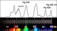 Dass die „Linien“ im Spektrum (‚peaks‘) dabei exakterweise Kurven mit einer bestimmten Breite sind, beruht dagegen auf Quanteneffekten. So zeigt ein Vergleich der beiden oberen Bilder (1, 2), dass die Spektral„linien“ mit steigendem Gasdruck breiter werden und die Breite dieser „Linien“ bei sehr hohem Druck so weit ansteigen kann, dass man praktisch ein Lichtkontinuum ähnlich dem eines strahlenden Festkörpers beobachtet. Ursache dieses Effekts ist die mit steigendem Druck zunehmende Häufigkeit gegenseitiger Störungen der Atome bei ihrem Zusammenprall. Am Beispiel der Spektrallinie bei 491,6 nm ist gut zu erkennen, wie stark die relative Intensität dieser Linie vom jeweiligen Gasdruck abhängt.