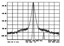 Durch Phasenrauschen („Skirt-Bildung“) wird die Sinusfrequenz spektral aufgeweitet, wie in nebenstehender Abbildung in Form eines Leistungsdichtespektrums (PSD) dargestellt.