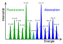 Ein Beispiel für eine solche Intensitätsverteilung zeigt Abbildung 2. Vibronische Übergänge vom elektronischen Grundzustand in den angeregten Zustand (Absorption) sind blau, die umgekehrten Übergänge (Fluoreszenz) dagegen in grün dargestellt. Die schmalen Linien werden beobachtet, wenn die Moleküle in Gasform vorliegen. Die gestrichelten Linien zeigen dagegen den Fall, dass die Moleküle in flüssiger oder fester Phase vorliegen: hier findet eine sogenannte Linienverbreiterung statt.