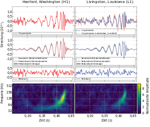 Ein andersartiges Signal, GW170817, wurde am 17. August 2017 von denselben drei Detektoren (zweimal Ligo sowie Virgo) registriert. Es wird als das Verschmelzen zweier Neutronensterne interpretiert, welche sich zuvor auf immer enger werdenden Spiralbahnen umkreist hatten. Mit einer Dauer von rund 100 Sekunden war das Signal viel länger als die zuvor beobachteten Signale vom Verschmelzen Schwarzer Löcher. Die beiden Objekte lagen wahrscheinlich im Massenbereich zwischen 1,1 und 1,6 Sonnenmassen (die Gesamtmasse betrug etwa 2,7 Sonnenmassen). Nahezu zeitgleich registrierte das Fermi Gamma-ray Space Telescope (FGST) einen kurzen Gammablitz (GRB 170817A), der dem gleichen Ereignis zugeordnet wird. Da der Gammablitz nur 1,7 Sekunden nach dem Ende des Gravitationssignals auftrat, ist nachgewiesen, dass die Geschwindigkeit von Gravitationswellen sich höchstens um einen winzigen Betrag von der des Lichts unterscheidet. Das schließt bestimmte zur Allgemeinen Relativitätstheorie alternative Gravitationstheorien aus. Durch die gute Richtungsauflösung des FGST konnte die Quelle, zuerst vom Las Campanas Observatorium in Chile, auch optisch identifiziert und beobachtet werden. Sie liegt in der 130 Millionen Lichtjahre entfernten Galaxie NGC 4993. Beobachtungen im infraroten, ultravioletten und Röntgenbereich folgten (das Nachglühen wird als sog. Kilonova bezeichnet). Im Rückstand der Kollision wurden schwere Elemente wie Gold, Platin und Uran identifiziert, zu deren Entstehung noch immer viele Fragen offen sind. Die Beobachtung liefert auch neue Erkenntnisse über den Aufbau von Neutronensternen. GW170817 war die erste gleichzeitige Beobachtung eines elektromagnetischen und eines Gravitations-Signals aus gleicher Quelle und eröffnete damit ein neues Kapitel der beobachtenden Astronomie. Sie ermöglicht auch eine unabhängige Bestimmung der Hubble-Konstante durch Beobachtung von Gravitationswellen. Der erhaltene Wert von H = 70,0 stimmt gut mit dem Wert aus Rotverschiebungen überein. Weiterhin ergaben sich neue Schranken für eine mögliche Verletzung der Lorentzinvarianz. Es war das Gravitationswellensignal mit der bisher am nächsten liegenden Quelle (etwa 70-mal die Entfernung der Andromedagalaxie), und die Beobachtung lieferte auch die erste Verbindung der bisher rätselhaften Gammablitze mit dem Verschmelzen von Neutronensternen.