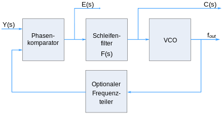 - Einem Frequenzteiler mit dem Teilerfaktor n, der die Ausgangsphase O(s) des Oszillators durch n teilt und so die rückgekoppelte Phase Z(s) an den Phasenvergleicher führt. Die Übertragungsfunktion des Frequenzteilers heißt Z(s)/O(s)= 1/n. Alle Phasen werden aus mathematischen Gründen in der Einheit rad (Radiant) angegeben.