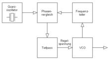 Ein Anwendungsbereich der PLL ist die Frequenzsynthese. Das nebenstehende Bild zeigt ein Blockschaltbild eines PLL-basierten Frequenzsynthesizers. Ein VCO (spannungsgesteuerter Oszillator) erzeugt das Ausgangssignal. Im Rückführungszweig der PLL ist ein Frequenzteiler vorgesehen, der die VCO-Frequenz vor dem Phasendetektor um einen einstellbaren Faktor herunterteilt. Das Referenzsignal der PLL wird typischerweise von einem genauen und stabilen Quarzoszillator bereitgestellt.