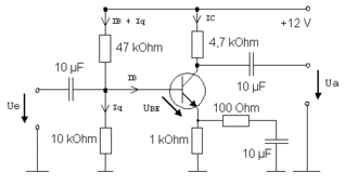 Die Verstärkung eines Transistors ist in Emitterschaltung besonders groß und – wenn keine hohe Leistung gefordert wird – genügt bei A-Betrieb ein Kollektorstrom von um 1 mA. Mit einer Stromgegenkopplung kann man erreichen, dass der gewählte Arbeitspunkt auch bei Exemplarstreuungen der Transistorparameter eingehalten wird und fast temperaturunabhängig ist. Dazu soll der Spannungsabfall am 1-kΩ-Widerstand zwischen Emitter und Masse (das sind die untersten Symbole, die an 0 V angeschlossen werden) etwa 1 V betragen, denn UBE kann – abhängig von Exemplar und Temperatur – um etwa 0,06 V schwanken.