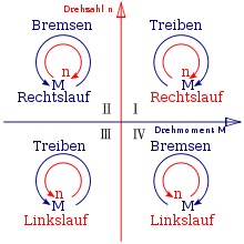 Ist der Umrichter in der Lage, in beiden Drehrichtungen Energie aus dem Zwischenkreis zum Motor und beim Bremsen auch zurück in den Zwischenkreis zu übertragen, spricht man von Vierquadrantenbetrieb.