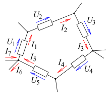 Die Leitungen bilden Maschen und Knoten, für welche die Maschen- und die Knotenregel gelten. Schaltungen mit linearen Bauelementen und mehreren Quellen können auch nach dem Überlagerungsprinzip nach Helmholtz berechnet werden.