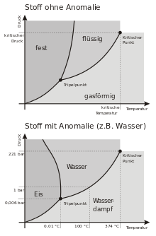 Bei den Druck- und Temperaturbedingungen, bei denen eine Resublimation auftritt, existiert kein flüssiger Aggregatzustand, wie im Phasendiagramm rechts ersichtlich. Man bezeichnet diese Bedingungen auch unabhängig von der Richtung der Phasenumwandlung als Sublimationsdruck und Sublimationstemperatur, beziehungsweise als Sublimationspunkt. Dieser wiederum ist ein Teil der Sublimationsdruckkurve des Phasendiagramms, die im nebenstehenden Beispiel die Phasengrenzlinie zwischen Feststoff und Flüssigkeit unterhalb des Tripelpunktes darstellt.