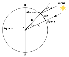 Das Prinzip der Gradmessung geht auf den alexandrinischen Mathematiker und Bibliotheksdirektor Eratosthenes zurück; er schätzte den Erdumfang um 240 v.Chr. aus dem um 7,2° unterschiedlichen Sonnenstand zwischen Alexandria und Syene (heutiges Assuan). Sein Ergebnis von 250.000 Stadien traf – je nach genauer Länge des verwendeten Stadions – den wahren Wert auf etwa 10 Prozent.