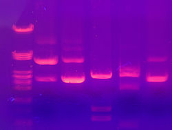 Agarosegele sind relativ großporig (150 nm bei einprozentigen, 500 nm bei 0,16-prozentigen Gelen) und eignen sich gut zur Trennung von DNA und hochmolekularen Proteinen. Die Distanz zwischen DNA-Banden unterschiedlicher Länge ist abhängig von der Konzentration an Agarose im Gel. Höhere Konzentrationen erfordern längere Laufzeiten (manchmal sogar Tage).[4] Haupteinsatzgebiet ist jedoch die Trennung von Nukleinsäuren. Agarosegele werden aus den natürlichen Polysaccharidpolymeren aus Seetang hergestellt. Bei der Elektrophorese mit Agarosegel handelt es sich um ein physikalisches Setting. Nach dem Experiment kann das Ergebnis mithilfe eines Plastikbeutels tiefgekühlt gelagert werden.[5]
