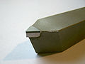 Hartmetalle sind durch Sintern hergestellte Verbundwerkstoffe. Sie bestehen aus einer weichen metallischen Bindephase (meist Cobalt) und den darin eingelagerten harten Carbiden Titan-, Wolfram-, Tantalcarbid oder Titannitrid.[5] Die Abkürzungen lauten HW für überwiegend aus Wolframcarbid, HT (Cermets) für überwiegend aus Titancarbid und Titannitrid bestehende Hartmetalle und HC für beschichtete Varianten. Die Härte und Zähigkeit ist abhängig von der Zusammensetzung der Carbide mit einer Größe von 1–10 µm und dem weichen Bindemittel, das in der Regel einen Volumenanteil bis 20 % einnimmt, wobei mehr Bindemittel die Schneide weicher und zäher macht.[6] Hartmetallschneidstoffe können neben Stahl und Gusseisen auch harte Werkstoffe wie Glas und Porzellan spanend bearbeiten. Sie werden meist in Form von Wendeschneidplatten eingesetzt, es gibt sie aber auch als Werkzeuge aus Vollhartmetall oder als eingelötete Hartmetall-Schneidplatten auf Werkzeugkörpern aus Stahl (Betonbohrer).